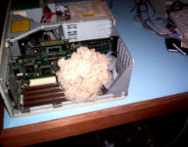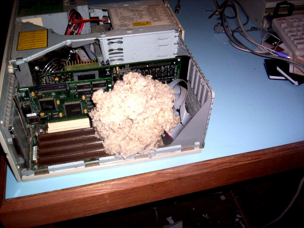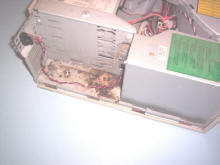 Mouse in computer One of my friends is a member of a pigeon racing club. Their old clubhouse was going to be demolished. He rescued the computer, took it home, then found that it wouldn't boot up. He called for advice, so I reminded him that he could probably fix it. I told him that computers often misbehave after being moved, and to check all wires and cables to make sure all the connectors were properly seated. I told him to press on "everything" with reasonable force (not enough to hurt his thumbs). An hour later, he called back with the question, "Is the computer supposed to have fluffy, fuzzy stuff in it?" He said it looked like the stuffing from a car seat. After a little more discussion, we guessed it was a mouse nest, since there had been an old couch in the building, along with grain bins for pigeon feed. The mouse had probably entered through the back of the computer, through a missing rear panel cover plate. I told him to take pictures before destroying the "mouse house" so I could show it to all my friends. Here are the pictures: (click picture for larger view)